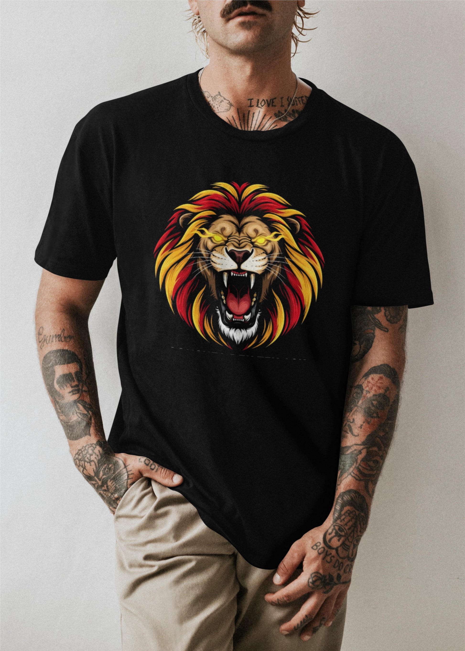 Yüksek çözünürlüklü baskı: Aslanın her bir tüy detayı ve alevli sarı-kırmızı renkleri, tişört üzerinde uzun süre ilk günkü gibi capcanlı kalır.
