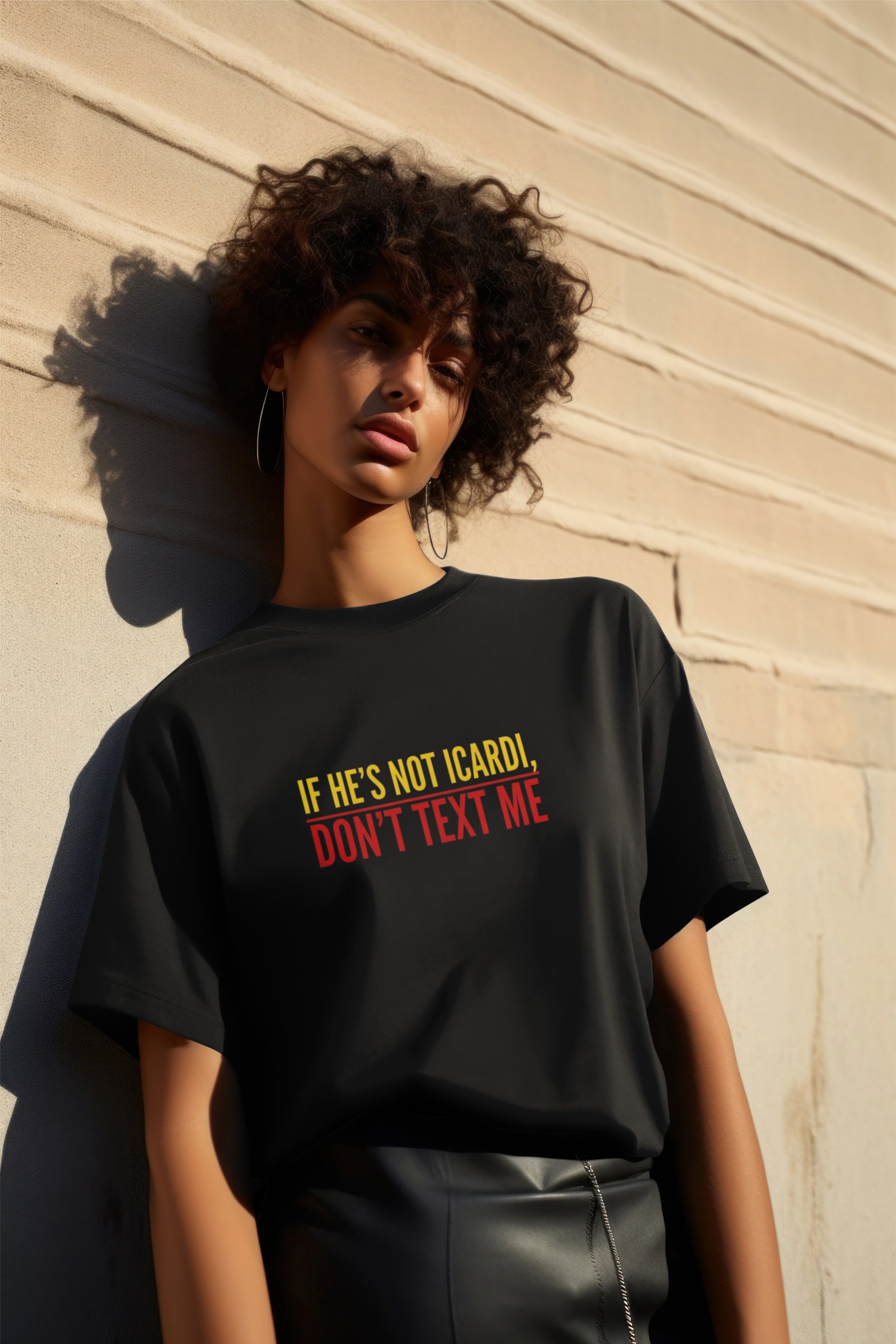 Bu tişört, futbola olan tutkusunu ve standartlarını esprili bir dille ortaya koyuyor! Üzerindeki "IF HE'S NOT ICARDI, DON'T TEXT ME" (Icardi Değilse, Yazma) sloganı, sadece bir futbolcuya olan hayranlığı değil, aynı zamanda karizmaya, yeteneğe ve asalete olan yüksek beklentini yansıtıyor. Sarı ve kırmızı renklerin vurguladığı bu mesaj, Galatasaraylı kadın taraftarların kendine güvenini ve mizah anlayışını sergiliyor. Kalbindeki aşk net: Icardi. Ve eğer o değilse, mesajlara yanıt yok!